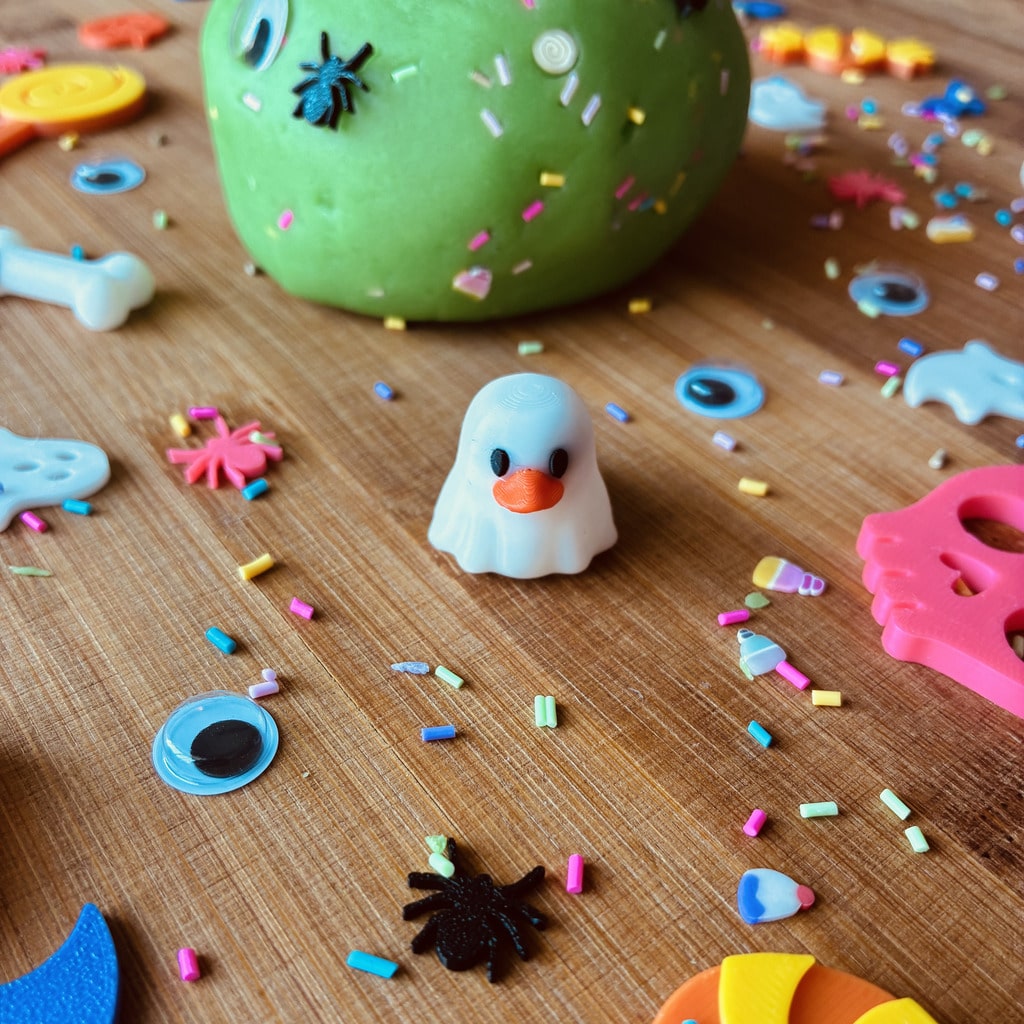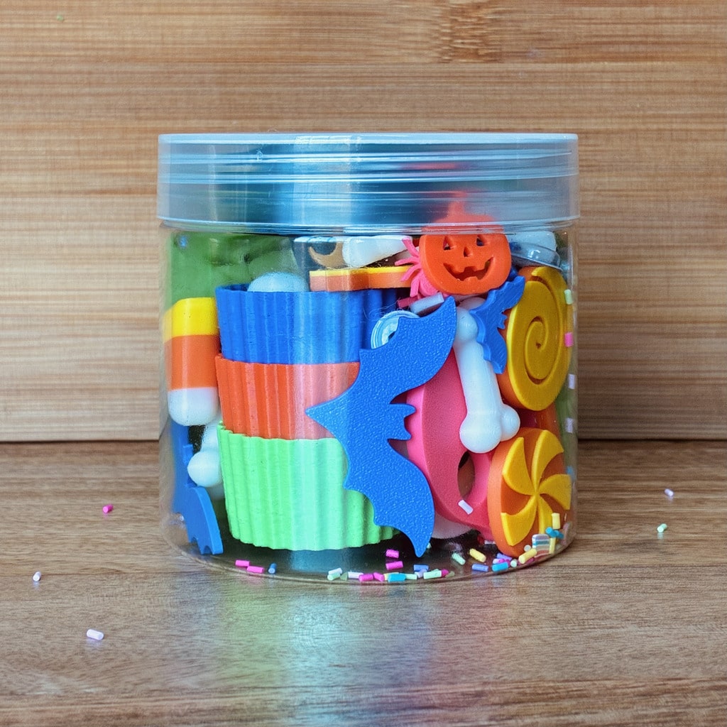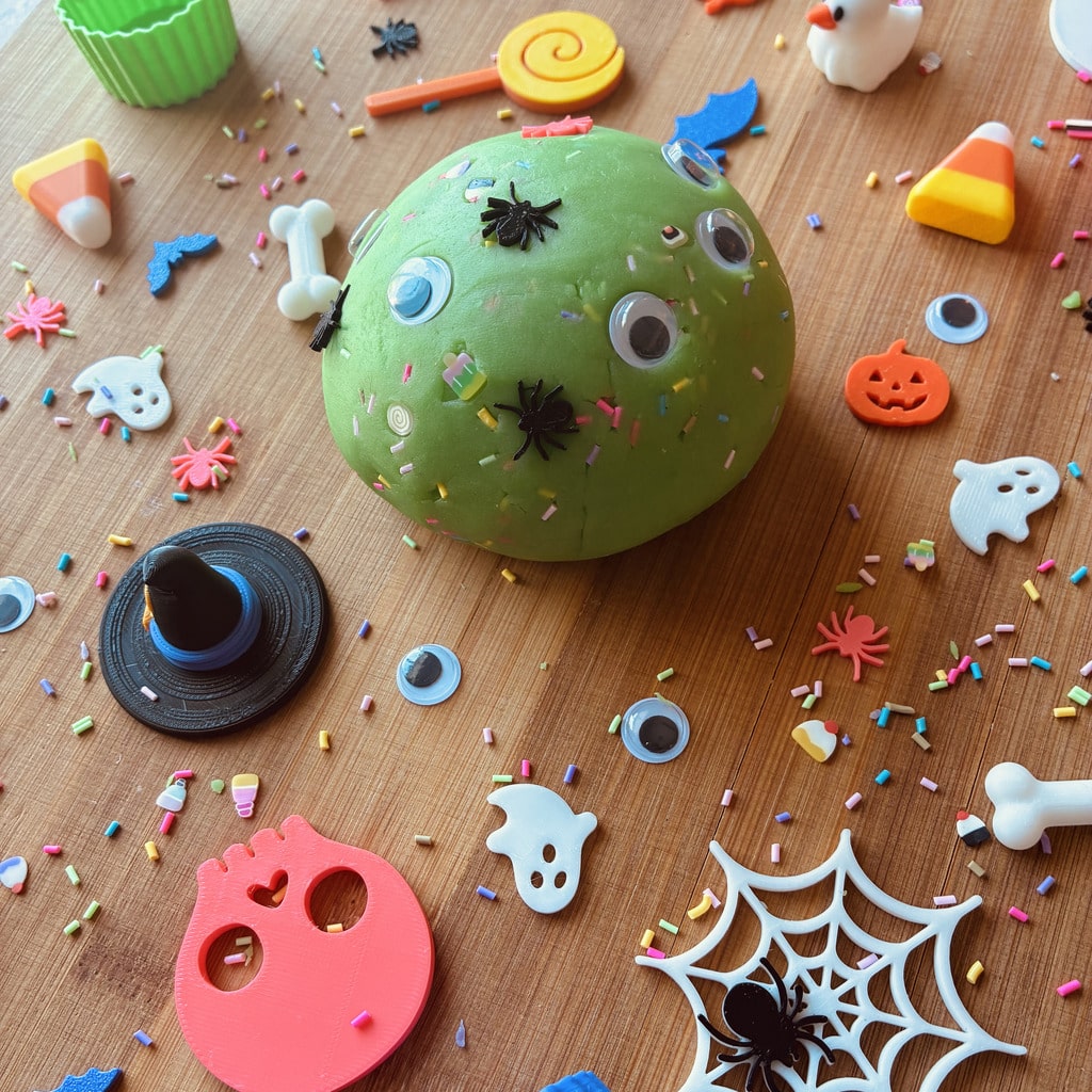 🍭 Assorted pretend toppings – candy corns, bones, webs, pumpkins, ghosts, bats, sweets, and eyeballs